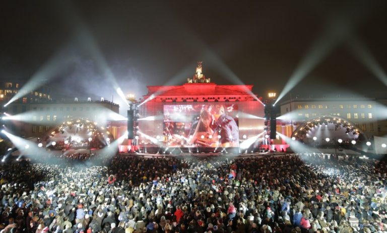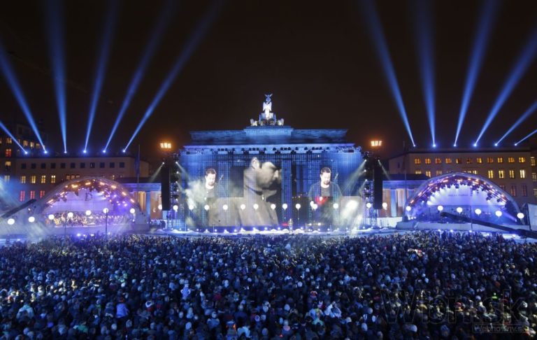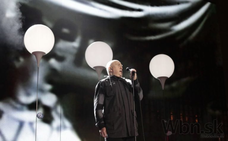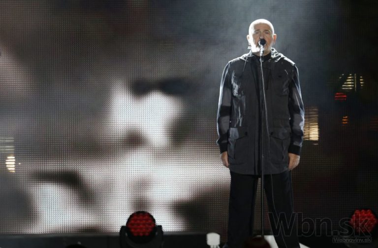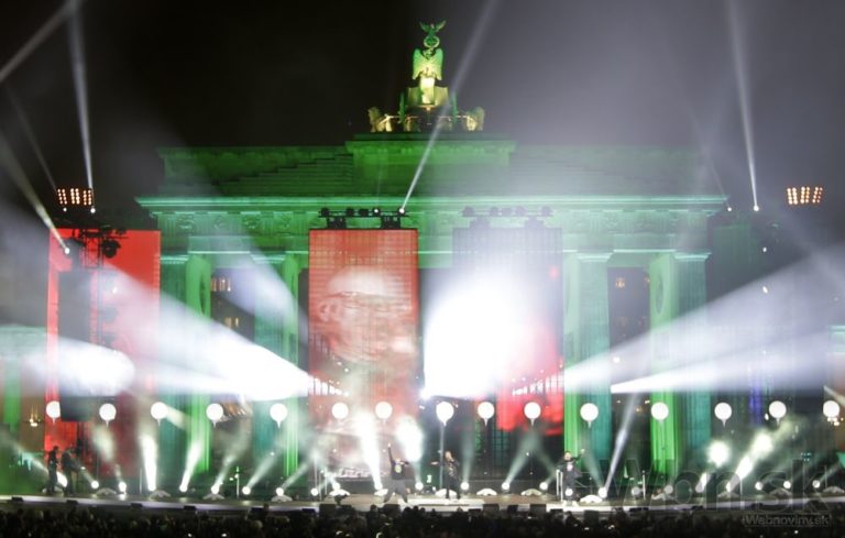 Britský spevák Peter Gabriel spieva pieseň 'Hrdinovia' pred Brandenburskou bránou v Berlíne počas osláv k 25. výročiu pádu Berlínskeho múru, Nemecko, 9. Nov., 2014. Foto: SITA/AP