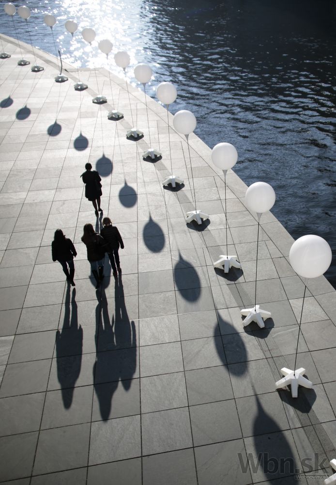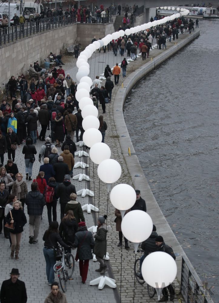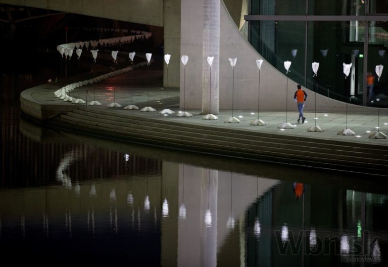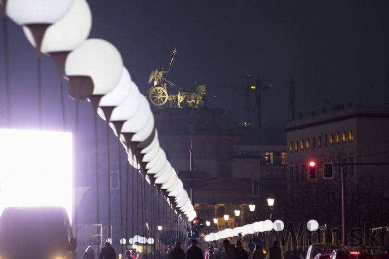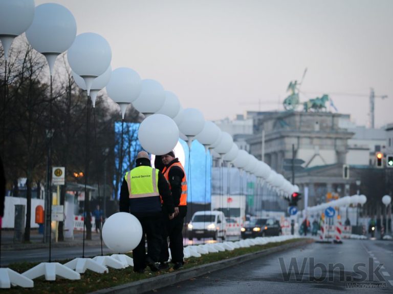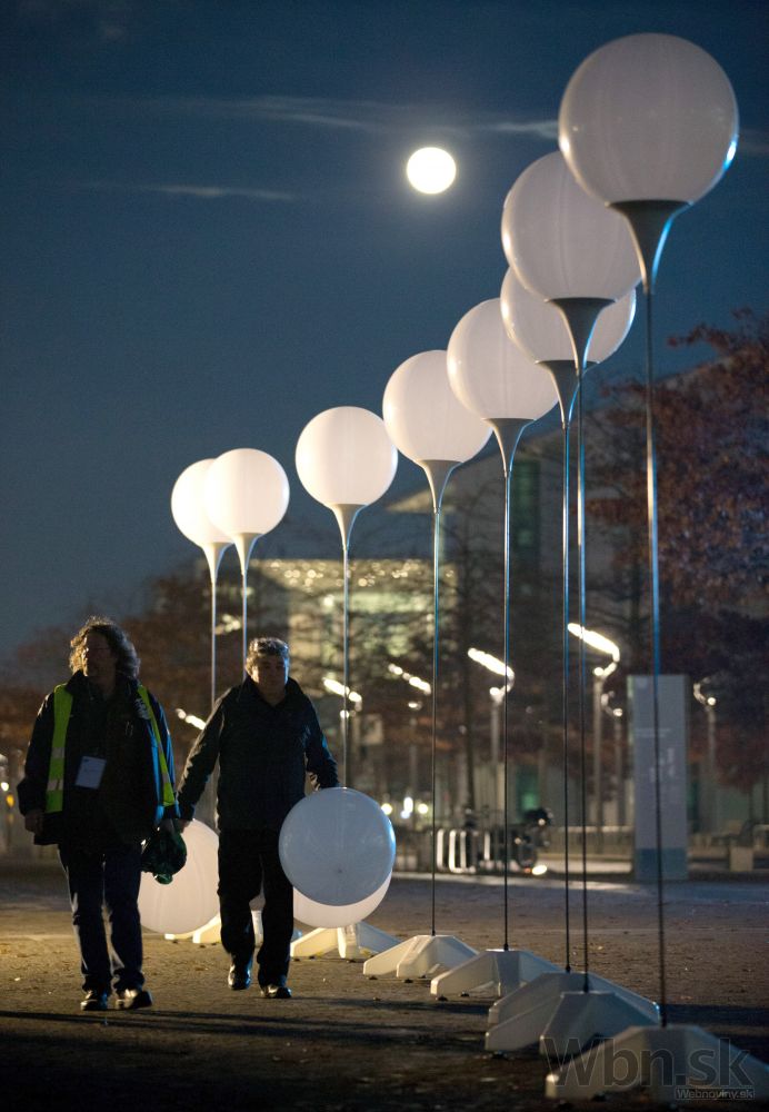Svietiace biele balóniky sú nainštalované pozdĺž bývalej cesty Berlínskeho múru, Berlín, 7. Nov., 2014. Foto: SITA/AP