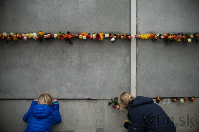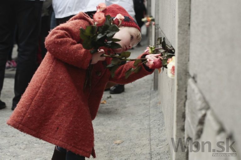 Trojročné dievčatko vkladá kvet do medzery bývalého Berlínskeho múru pri príležitosti osláv jeho pádu, Nemecko, 9. Nov., 2014. Foto: SITA/AP