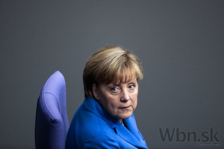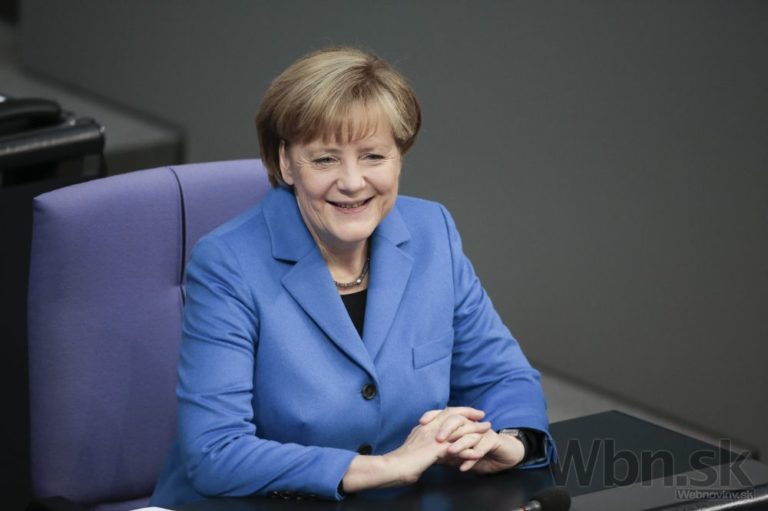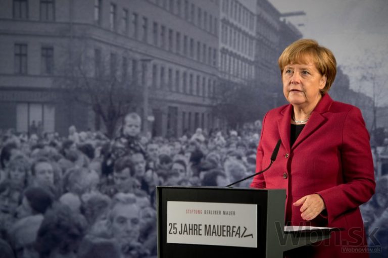 Nemecká kancelárka Angela Merkelová prednáša prejav pred historickou fotografiou pri príležitosti osláv pádu Berlínskeho múru, Nemecko, 9. Nov., 2014. Foto: SITA/AP