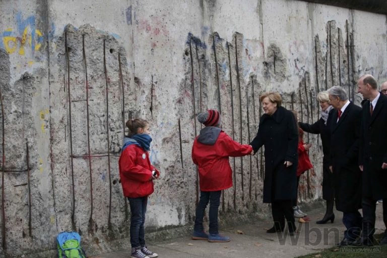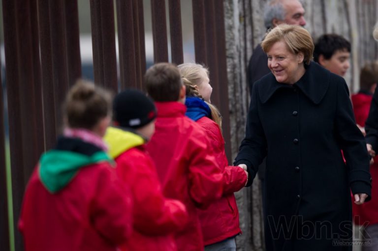 Nemecká kancelárka Angela Merkelová si potriasa rukou s deťmi pri príležitosti osláv pádu Berlínskeho múru, Nemecko, 9. Nov., 2014. Foto: SITA/AP