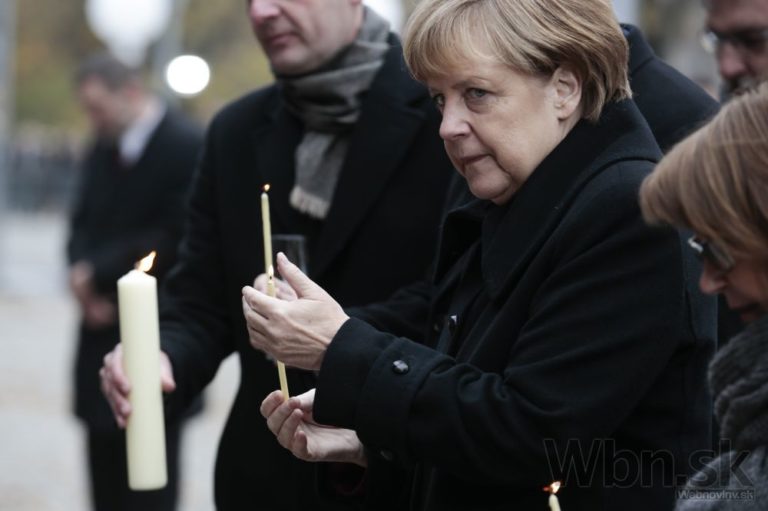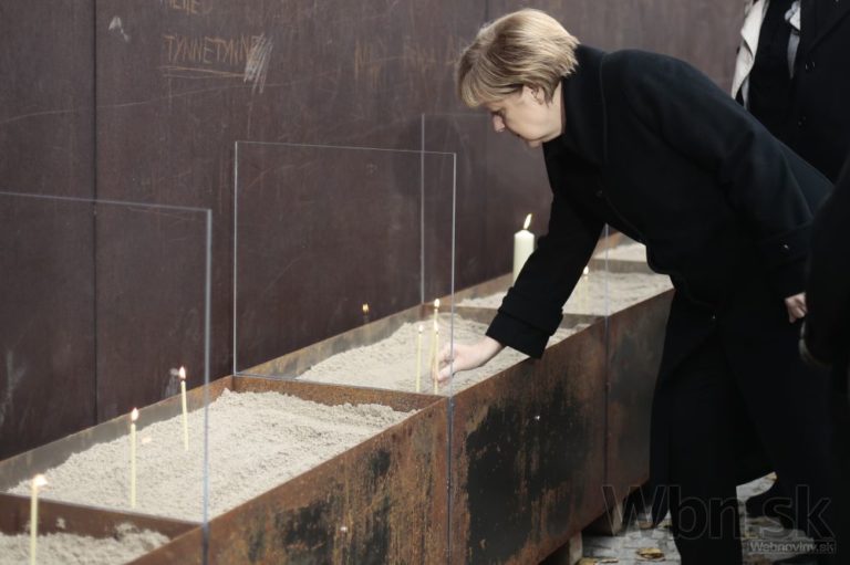 Nemecká kancelárka Angela Merkelová umiestňuje zapálenú sviečku na pamiatku obetí Berlínskeho múru pri príležitosti osláv jeho pádu, Nemecko, 9. Nov., 2014. Foto: SITA/AP