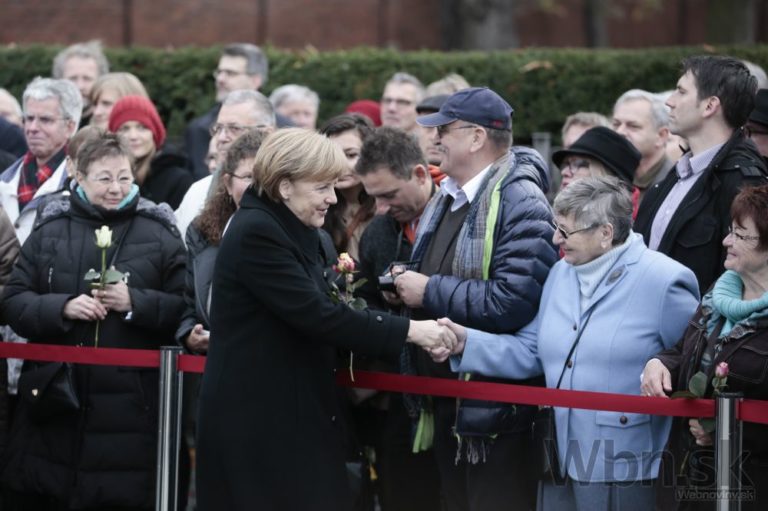 Nemecká kancelárka Angela Merkelová sa rozpráva s návštevníkmi osláv pádu Berlínskeho múru, Nemecko, 9. Nov., 2014. Foto: SITA/AP