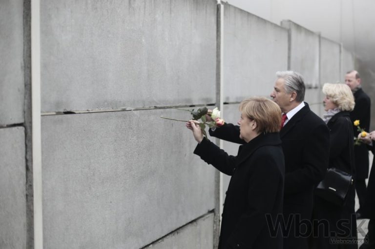 Nemecká kancelárka Angela Merkelová vkladá kvet do medzery bývalého Berlínskeho múru, Nemecko, 9. Nov., 2014. Foto: SITA/AP