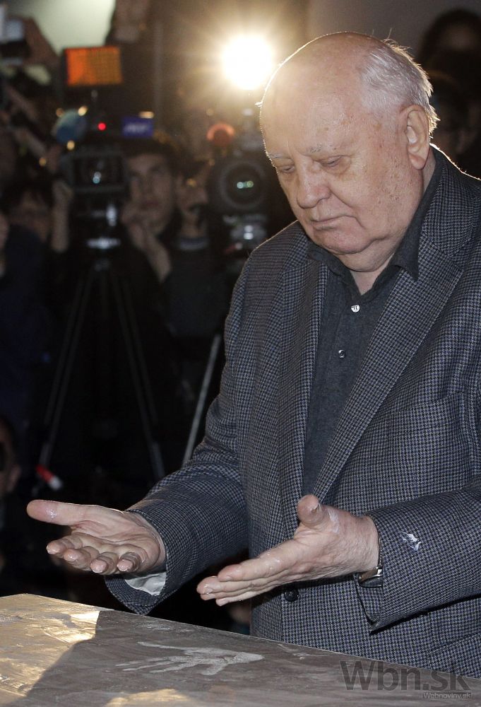Bývalý sovietsky vodca Michail Gorbačov robí odtlačok svojich rúk do betónu pripevneného ku kusu Berlínskeho múru počas recepcie na Checkpoint Charlie v Berlíne, Berlín 7. Nov., 2014. Foto: SITA/AP