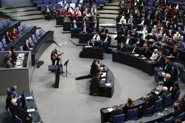Nemecký pesničkár a bývalý východonemecký disident Wolf Biermann (v strede) vystúpil počas osobitného zasadnutia nemeckého parlamentu pri príležitosti 25. výročia pádu Berlínskeho múru v Bundestagu v Berlíne, piatok 7.Nov., 2014. Foto: SITA/AP
