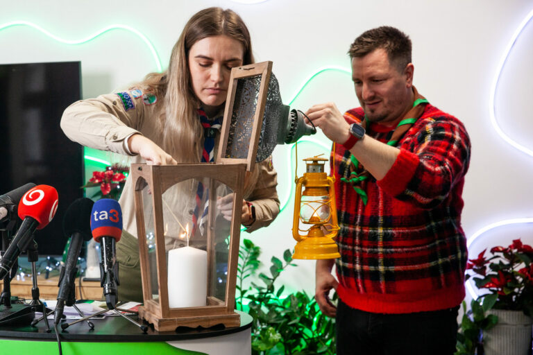 Zľava: Riaditeľka ústredia Slovenských skautov Mária Budzáková a riaditeľ občianskeho združenia IPčko Marek Madro pri odpaľovaní plamienka z Betlehemského svetla počas tlačovej konferencie v priestoroch centrály IPčka v Bratislave pri príležitosti predstavenia Vianočného plánu pomoci IPčka 2024 a ohlásenia špeciálnej spolupráce so Slovenským skautingom a s Betlehemským svetlom. Bratislava, 19. december 2024. Foto: SITA/Tomáš Bokor