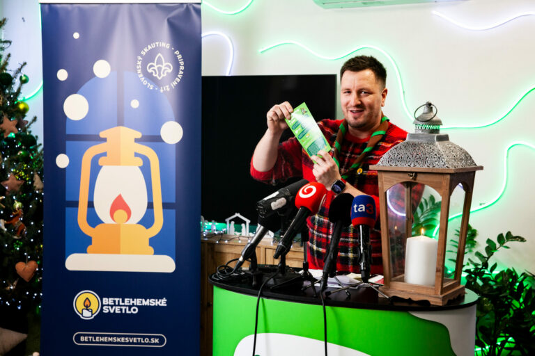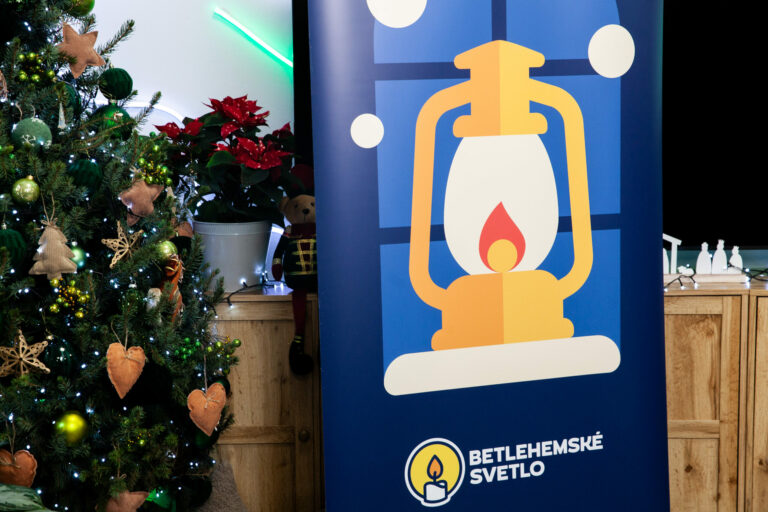 Banner Betlehemského svetla počas tlačovej konferencie v priestoroch centrály IPčka v Bratislave pri príležitosti predstavenia Vianočného plánu pomoci IPčka a ohlásenia špeciálnej spolupráce so Slovenským skautingom a s Betlehemským svetlom. Bratislava, 19. december 2024. Foto: SITA/Tomáš Bokor