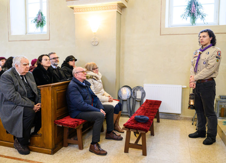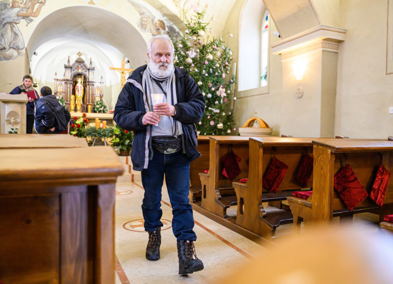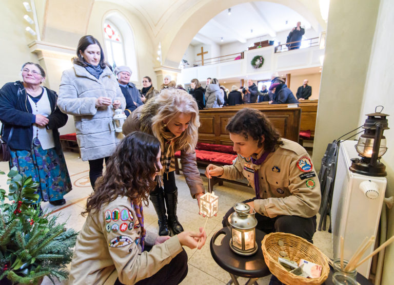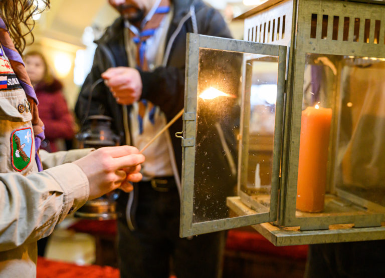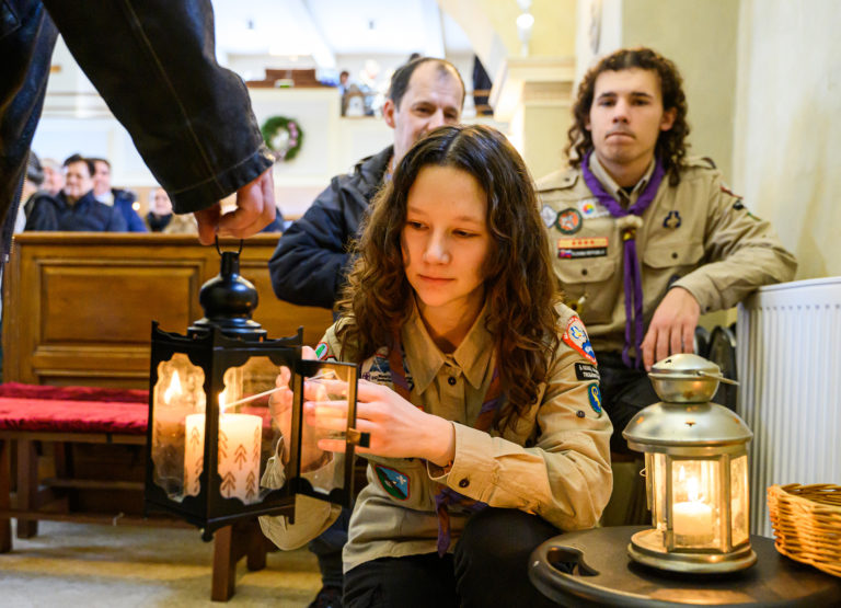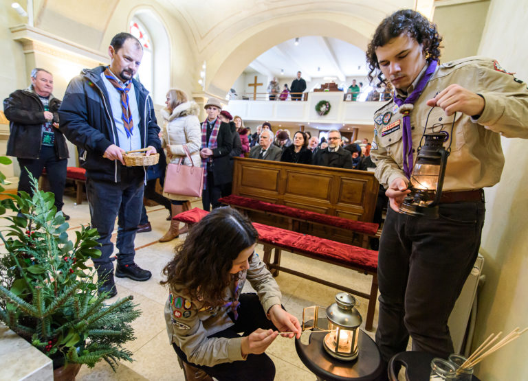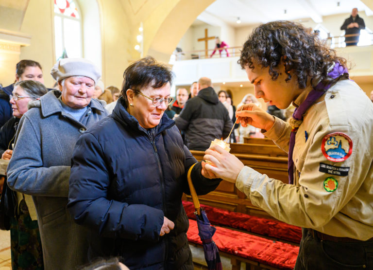 Betlehemské svetlo v Kostole sv. Urbana v Nitre, ktoré prinesli zoborskí skauti. Nitra, 24. december 2023. Foto: SITA/Martin Havran