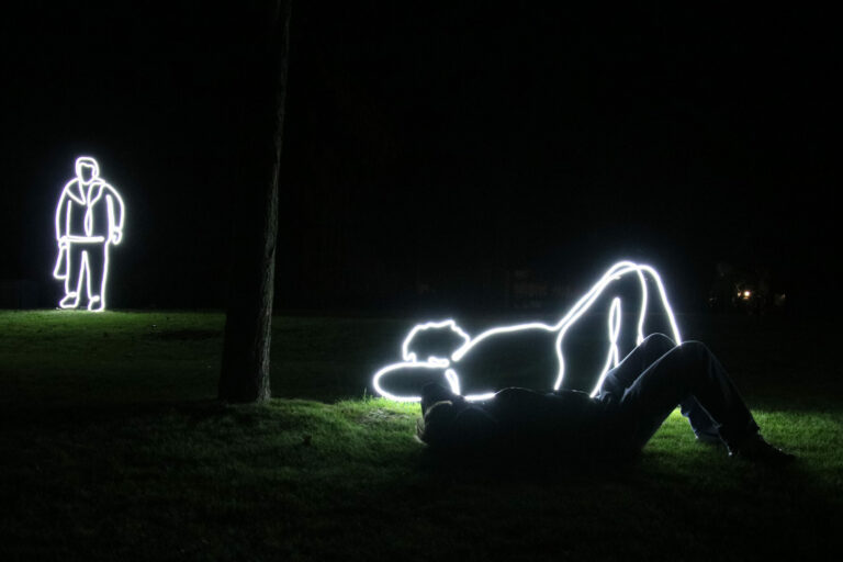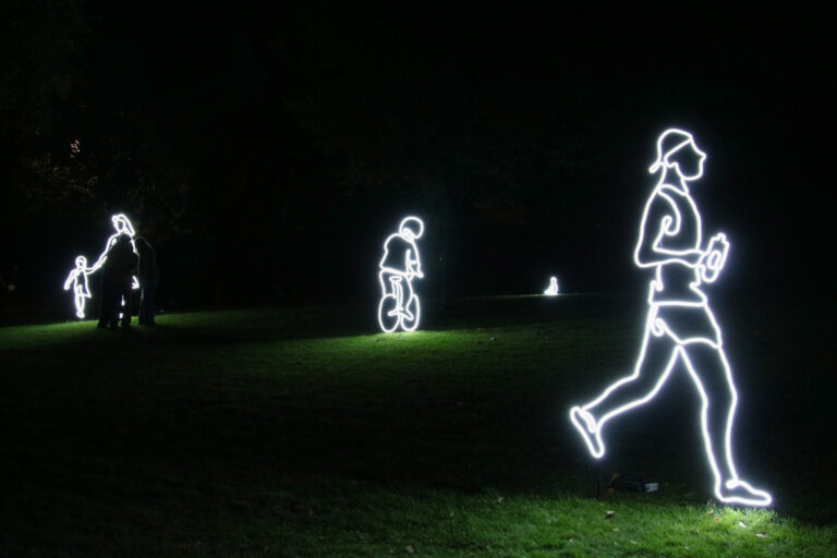 Svetelná inštalácia minimalistických figúr od umelcov BN Label počas festivalu súčasného umenia Biela noc 2025. Bratislava, 3. október 2025. Foto: SITA/Andrea Mezeiová
