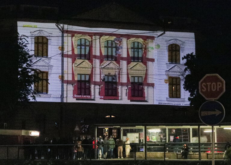 Ľudia sledujú zo zastávky Zochova mapping Fasáda 03., vytvorený študentmi Vysokej školy múzických umení (VŠMU) počas festivalu súčasného umenia Biela noc 2025. Bratislava, 3. október 2025. Foto: SITA/Andrea Mezeiová