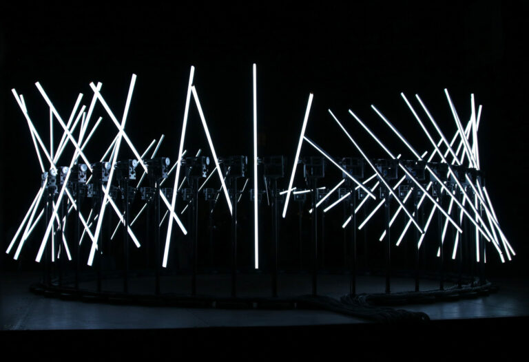 Kinetická svetelná inštalácia Flux od Collectif Scale, vytvorená v spolupráci so spoločnosťou Západoslovenská energetika (ZSE), zachytená s dlhou expozíciou počas festivalu súčasného umenia Biela noc 2025. Bratislava, 3. október 2025. Foto: SITA/Andrea Mezeiová