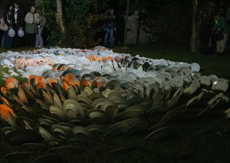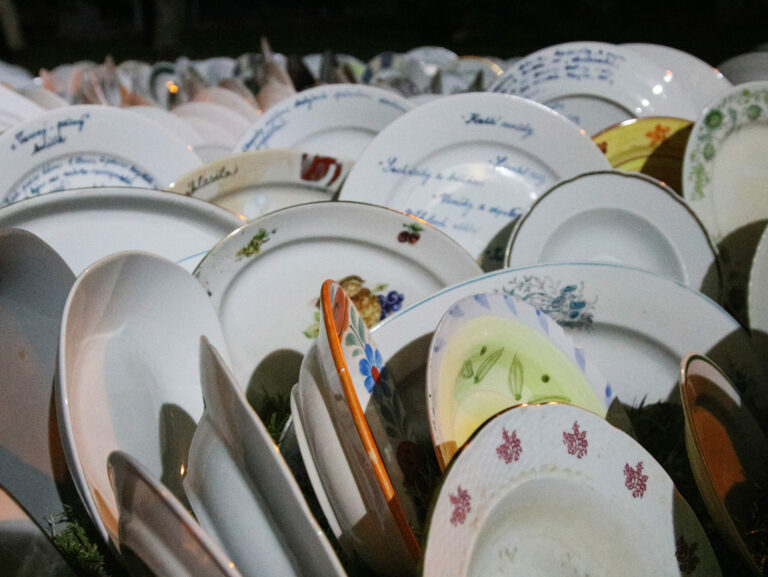 Site-specific inštalácia Sediment z porcelánových tanierov od slovenskej výtvarnej umelkyne Andrey Čepiššákovej počas festivalu súčasného umenia Biela noc 2025. Bratislava, 3. október 2025. Foto: SITA/Andrea Mezeiová