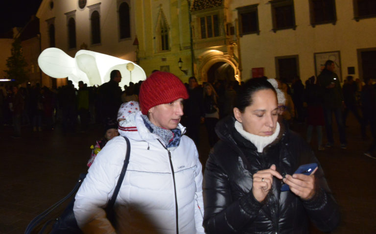 Účastníčky Medzinárodného festivalu súčasného umenia Biela noc 2017 na Hlavnom námestí v Bratislave. V pozadí: Jedno z inštalovaných diel Fantastic Planet - Humanoid, diela pozostávajúceho z piatich nadľudských svietiacich postáv ktoré navštívili planétu Zem, ktorých autorkou je Amanda Parer. Bratislava, 7. október 2017. Foto: SITA/Štefan Laktiš.
