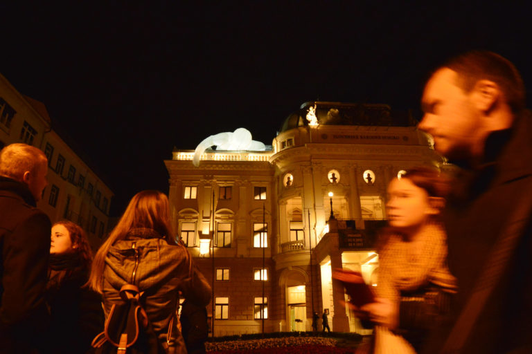 Festivaloví účastníci pri jednom z inštalovaných diel Fantastic Planet - Humanoid na starej budove Slovenského národného divadla, diela pozostávajúceho z piatich nadľudských svietiacich postáv ktoré navštívili planétu Zem, ktorých autorkou je Amanda Parer počas Medzinárodného festivalu súčasného umenia Biela noc 2017. Bratislava, 7. október 2017. Foto: SITA/Štefan Laktiš.