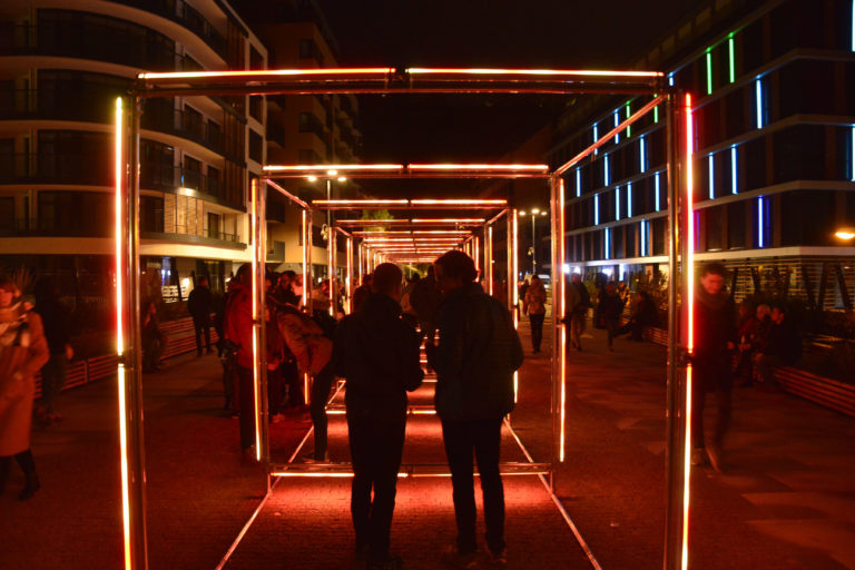 Svetelná interaktívna inštalácia v priestore Zuckermandel v Bratislave, ktorého autorom je SHOWMEDIA, počas Medzinárodného festivalu súčasného umenia Biela noc 2017. Bratislava, 7. október 2017. Foto: SITA/Štefan Laktiš.