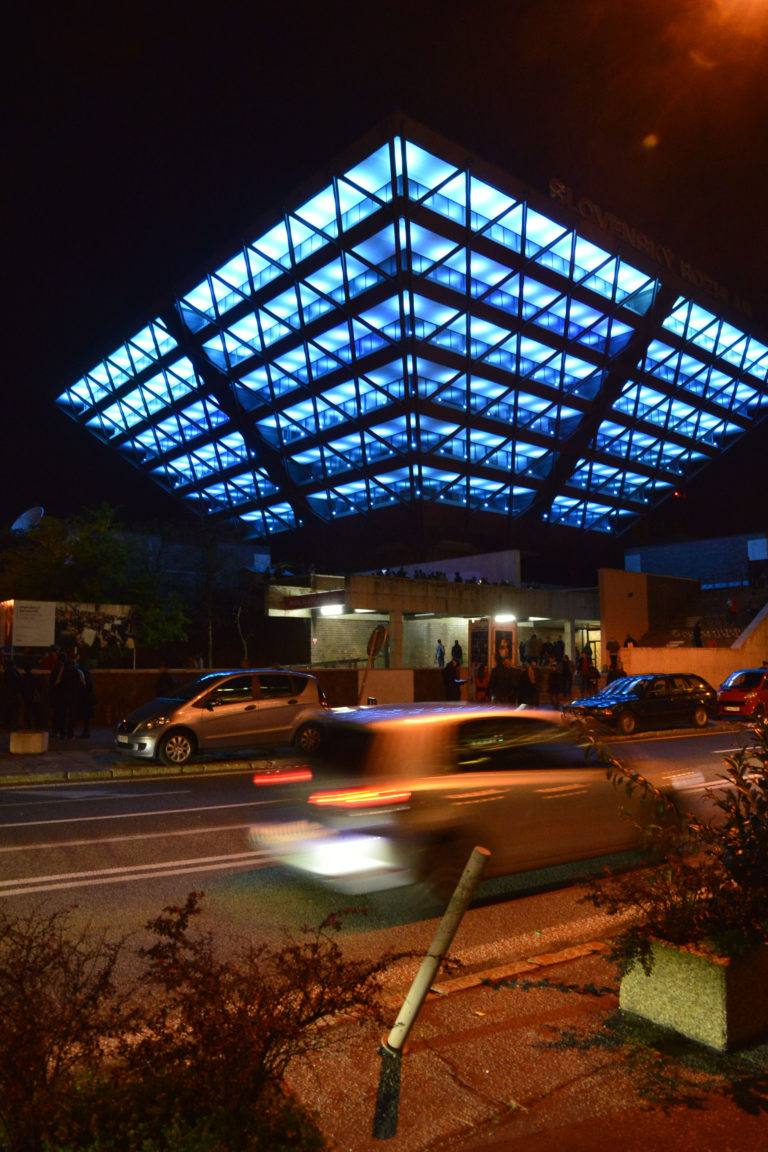 Audiovizuálna inštalácia vytvorená špeciálne pre budovu Slovenského rozhlasu (na snímke), ktorej autormi sú Ondrej Maksi a Jana Potiron počas Medzinárodného festivalu súčasného umenia Biela noc 2017. Bratislava, 7. október 2017. Foto: SITA/Štefan Laktiš.