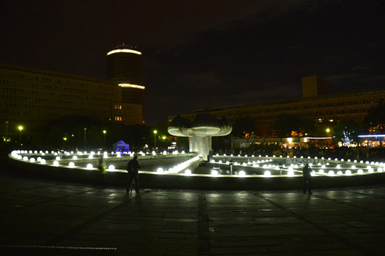 Svetelná inštalácia vo fontáne Družba na Námestí slobody v Bratislave, ktorej autorom je Collectif Coin, počas Medzinárodného festivalu súčasného umenia Biela noc 2017. Bratislava, 7. október 2017. Foto: SITA/Štefan Laktiš.