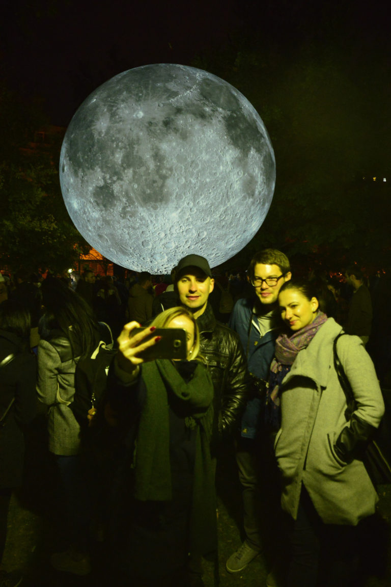 Účastníci festivalu sa fotia pri inštalácii Monumentálneho mesiaca (Museum of the Moon) v Medickej záhrade v Bratislave pozostávajúceho zo záberov NASA z povrchu Mesiaca, ktorého autorom je umelec Luke Jerram počas Medzinárodného festivalu súčasného umenia Biela noc 2017. Bratislava, 7. október 2017. Foto: SITA/Štefan Laktiš.
