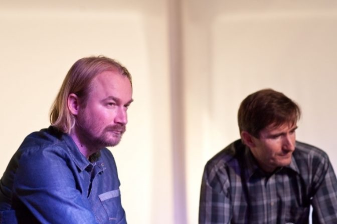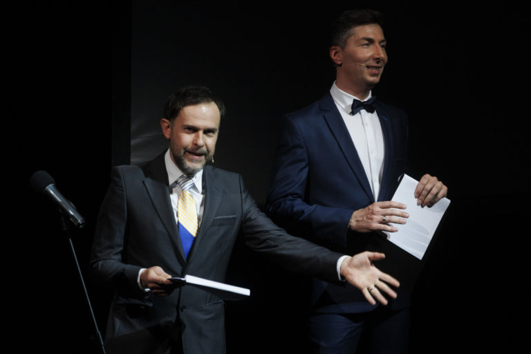 Moderátori Juraj Kemka a Martin Staňo počas slávnostného udeľovania ocenení Biela vrana 2022. Bratislava, 17. november 2022. Foto: SITA/Branislav Bibel.