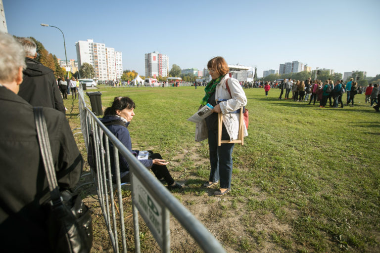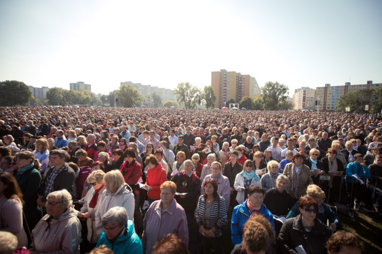 Návštevníci pred začiatkom pontifikálnej svätej omše blahorečenia slovenského saleziána kňaza Titusa Zemana. Bratislava, 30. september 2017. Foto: SITA/Diana Černáková