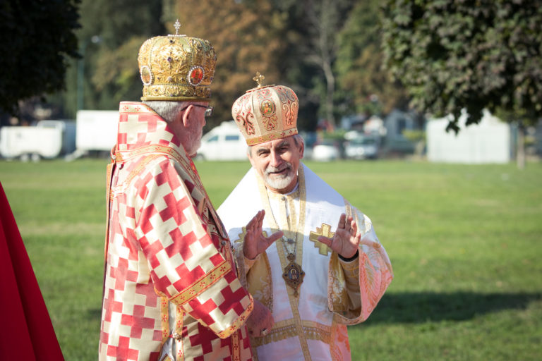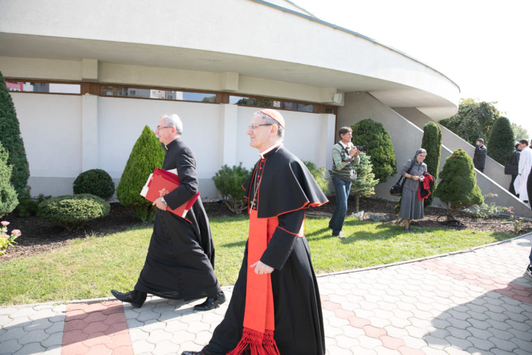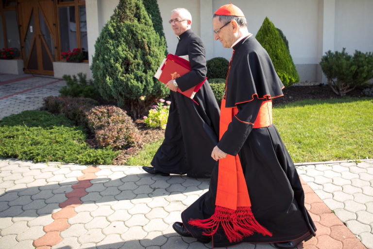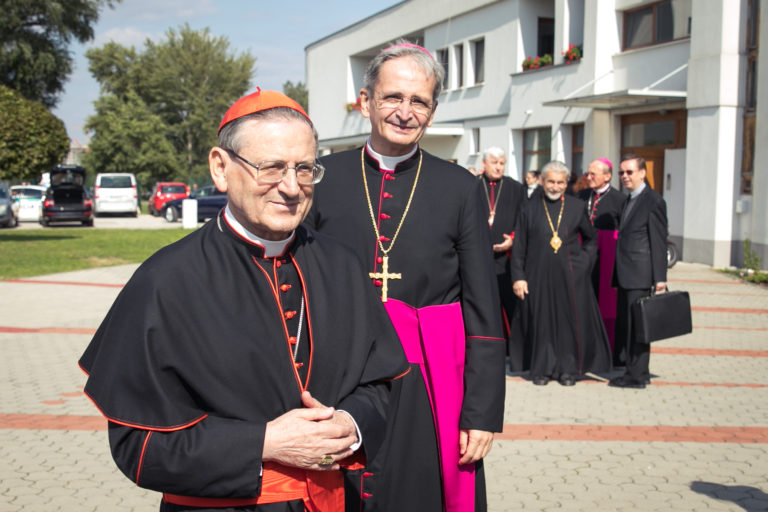 Legát Svätého otca Františka, kardinál Angelo Amato, prefekt Kongregácie pre kauzy svätých (vpravo) počas TB po pontifikálnej svätej omši blahorečenia slovenského saleziána kňaza Titusa Zemana. Bratislava, 30. september 2017. Foto: SITA/Diana Černáková