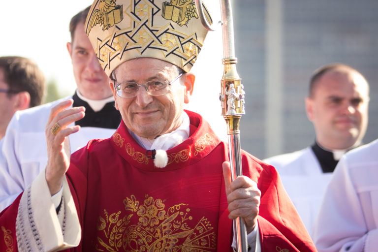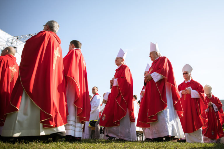 Legát Svätého otca Františka, kardinál Angelo Amato, prefekt Kongregácie pre kauzy svätých (v popredí) počas TB po pontifikálnej svätej omši blahorečenia slovenského saleziána kňaza Titusa Zemana. Bratislava, 30. september 2017. Foto: SITA/Diana Černáková