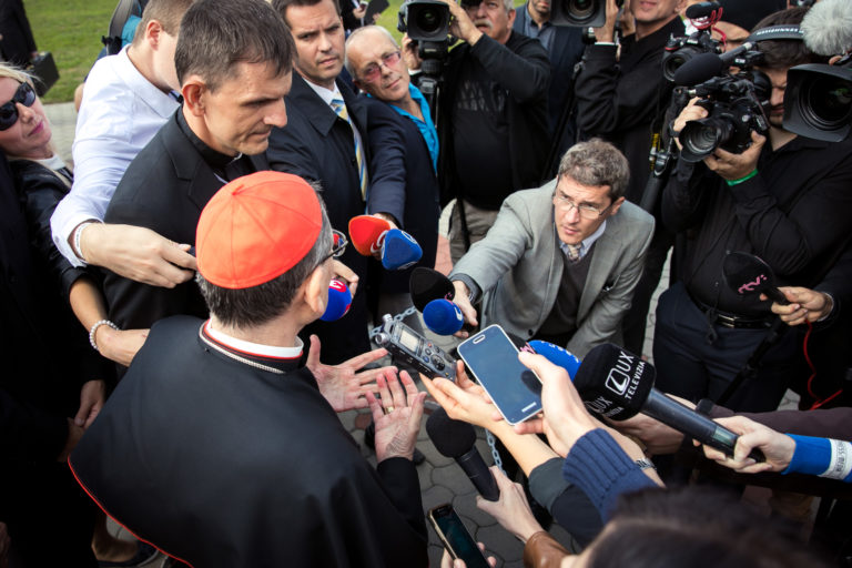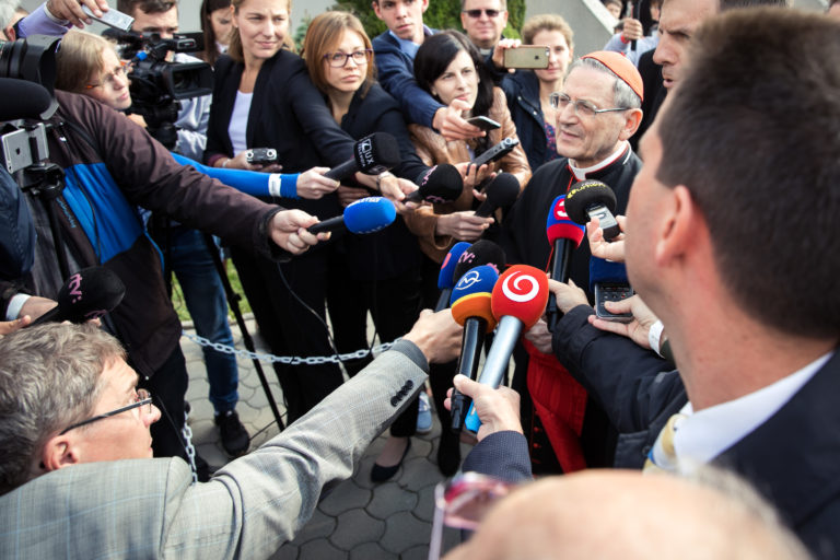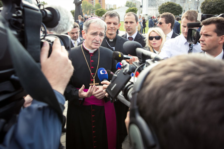 Bratislavský arcibiskup Stanislav Zvolenský (vľavo) počas TB po pontifikálnej svätej omši blahorečenia slovenského saleziána kňaza Titusa Zemana. Bratislava, 30. september 2017. Foto: SITA/Diana Černáková