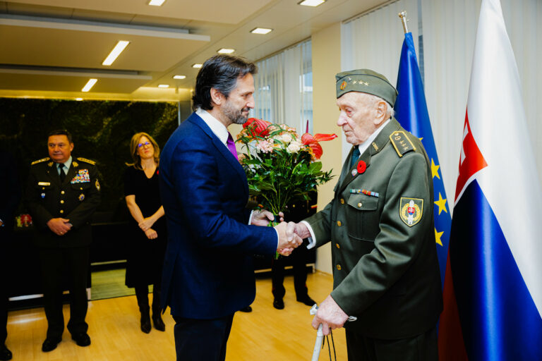 V popredí sprava: Vojnový veterán a účastník Slovenského národného povstania (SNP) Branislav Tvarožek a náčelník Generálneho štábu OS SR Daniel Zmeko počas blahoželania k 100. narodeninám vojnovému veteránovi Branislavovi Tvarožkovi na Ministerstve obrany SR v Bratislave. Bratislava, 2. december 2025. Foto: SITA/Kancelária prezidenta SR