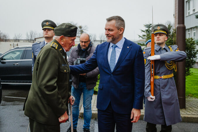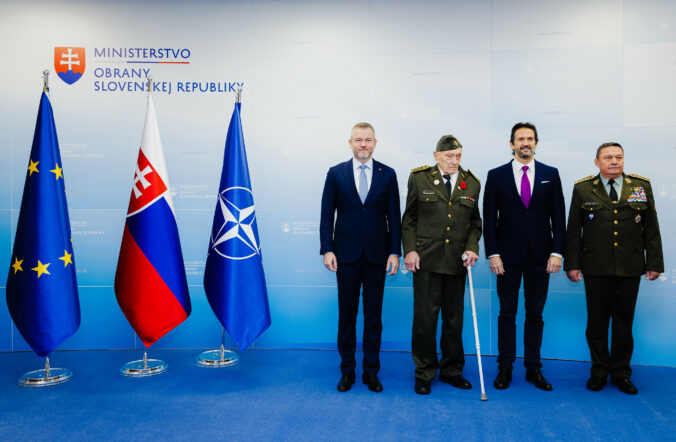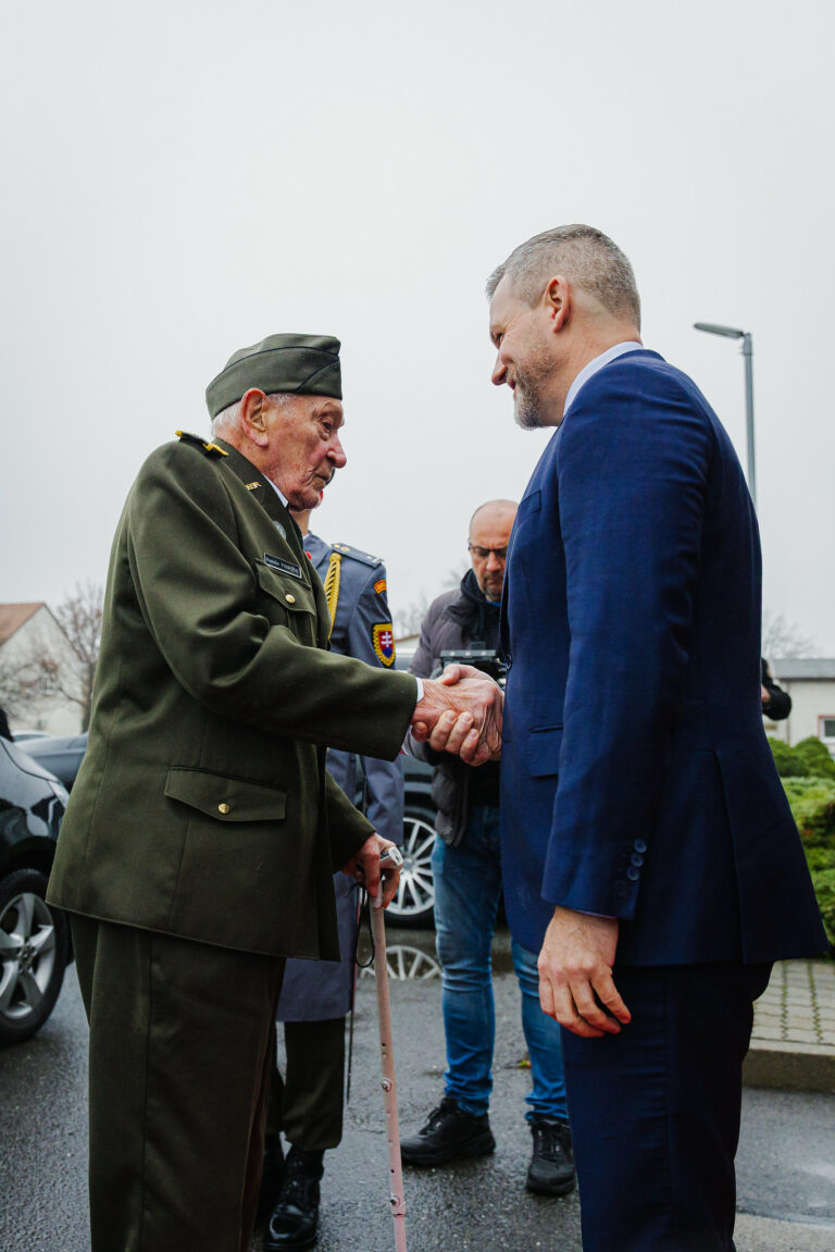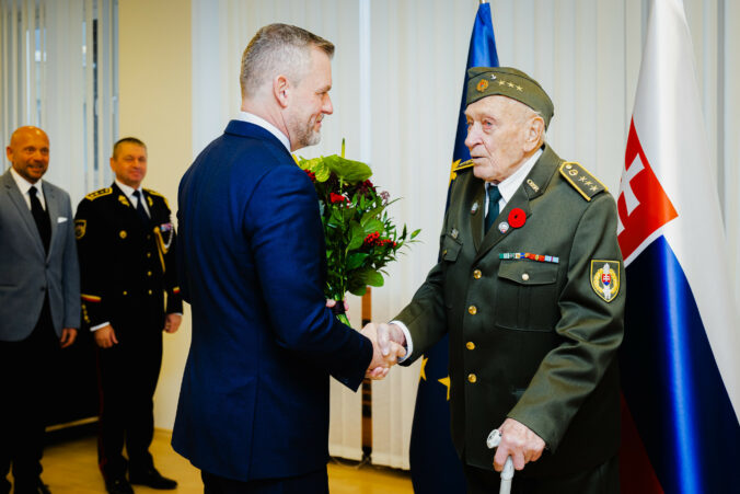 V popredí zľava: Vojnový veterán a účastník Slovenského národného povstania (SNP) Branislav Tvarožek a prezident SR Peter Pellegrini počas blahoželania k 100. narodeninám vojnovému veteránovi Branislavovi Tvarožkovi na Ministerstve obrany SR v Bratislave. Bratislava, 2. december 2025. Foto: SITA/Kancelária prezidenta SR