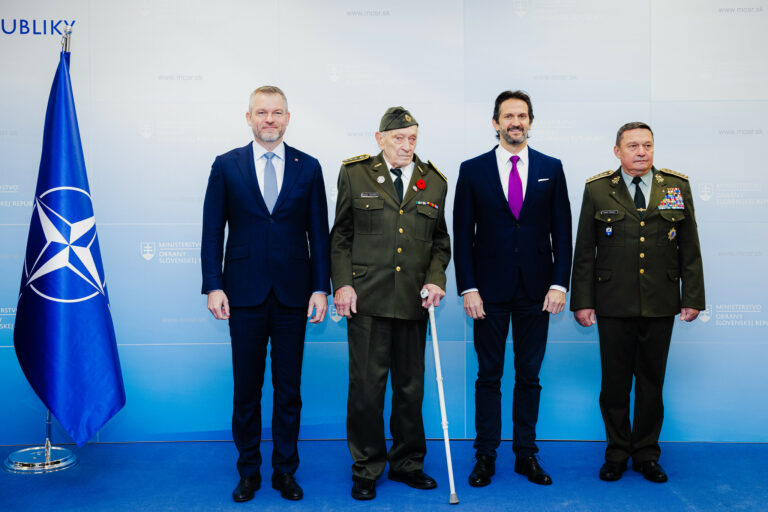V popredí sprava: prezident SR Peter Pellegrini, náčelník Generálneho štábu OS SR Daniel Zmeko, vojnový veterán a účastník Slovenského národného povstania (SNP) Branislav Tvarožek a minister obrany SR Robert Kaliňák počas príchodu na Ministerstvo SR v rámci blahoželania k 100. narodeninám vojnovému veteránovi Branislavovi Tvarožkovi. Bratislava, 2. december 2025. Foto: SITA/Kancelária prezidenta SR