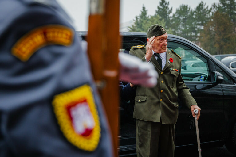 Vojnový veterán a účastník Slovenského národného povstania (SNP) Branislav Tvarožek počas príchodu na Ministerstvo obrany SR v rámci blahoželania k jeho 100. narodeninám. Bratislava, 2. december 2025. Foto: SITA/Kancelária prezidenta SR