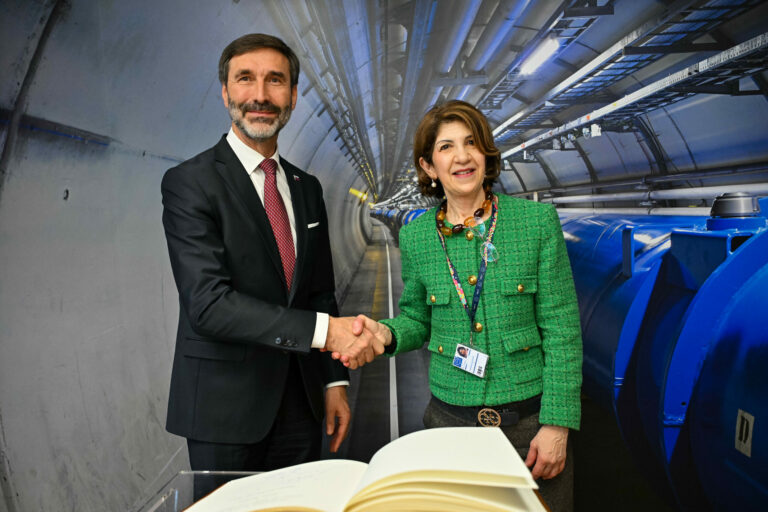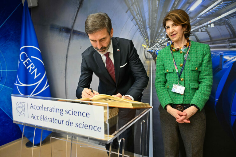 Zľava: Minister zahraničných vecí a európskych záležitostí SR Juraj Blanár a generálna riaditeľka CERN-u Fabiola Gianotti počas prehliadky európskeho laboratória pre časticovú fyziku CERN v rámci pracovnej návštevy ministra vo Švajčiarsku. Ženeva, Švajčiarsko, 25. február 2025. Foto: SITA/MZV