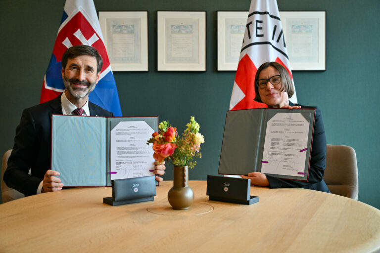 Zľava: Minister zahraničných vecí a európskych záležitostí SR Juraj Blanár a prezidentka Medzinárodného výboru Červeného kríža Mirjana Spoljaričová Eggerová počas podpisu Memoranda o porozumení na roky 2025 – 2028 v rámci pracovnej návštevy ministra vo Švajčiarsku. Ženeva, Švajčiarsko, 26. február 2025. Foto: SITA/MZV