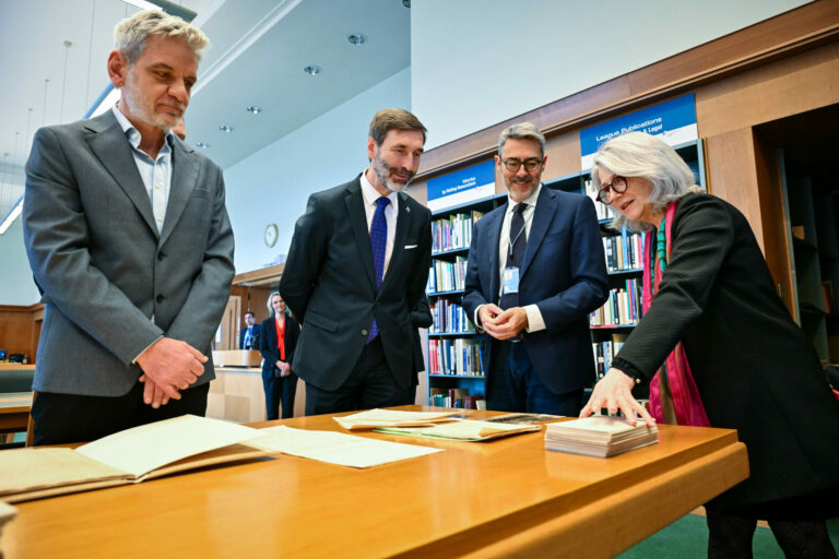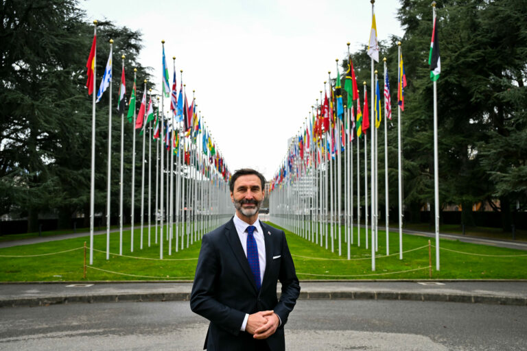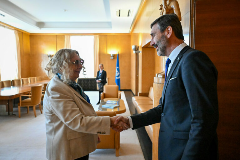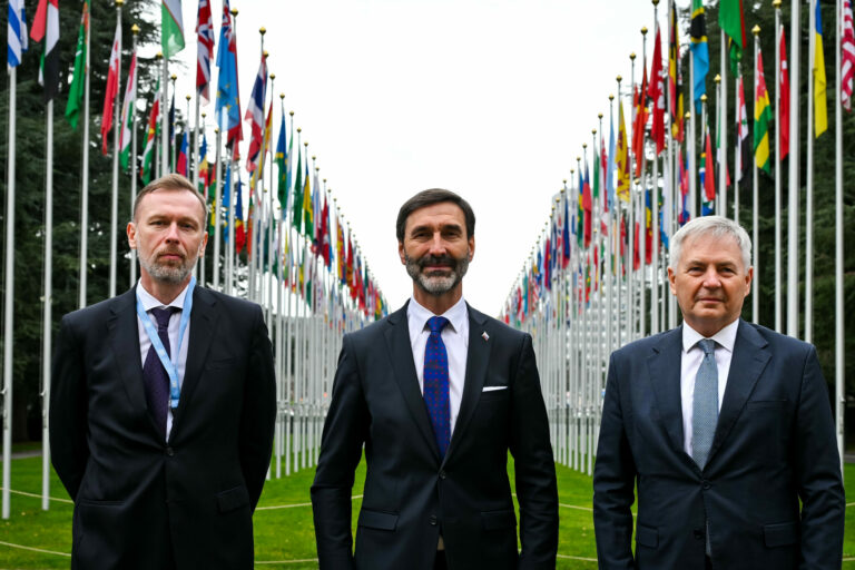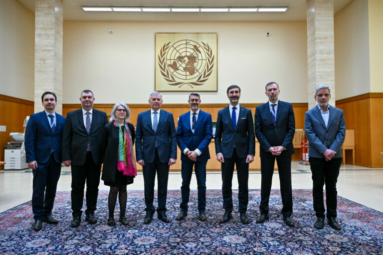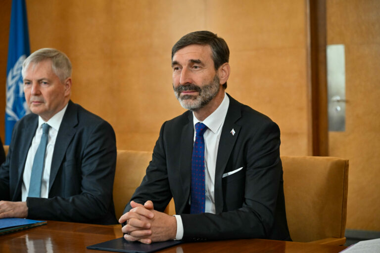Uprostred sprava: Minister zahraničných vecí a európskych záležitostí SR Juraj Blanár a generálna riaditeľka Úradovne OSN Tatiana Valovaya počas pracovnej návštevy ministra vo Švajčiarsku. Ženeva, Švajčiarsko, 26. február 2025. Foto: SITA/MZV