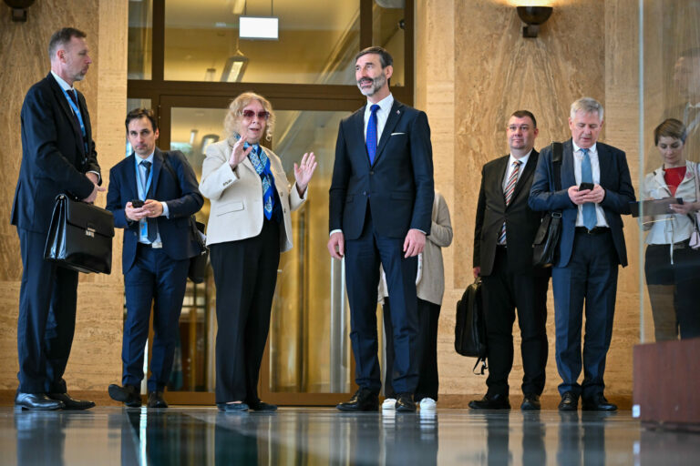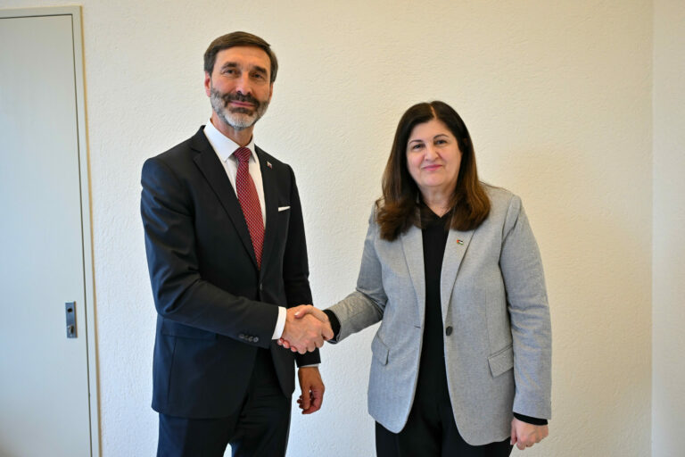 Zľava: Minister zahraničných vecí a európskych záležitostí SR Juraj Blanár a ministerka zahraničných vecí Palestíny Varsen Aghabekyan Šahínová v rámci pracovnej návštevy ministra vo Švajčiarsku. Ženeva, Švajčiarsko, 27. február 2025. Foto: SITA/MZV