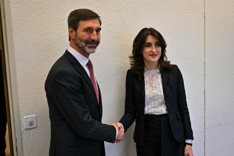 Zľava: Minister zahraničných vecí a európskych záležitostí SR Juraj Blanár a gruzínska ministerka zahraničných vecí Maka Bočorišviliová v rámci pracovnej návštevy ministra vo Švajčiarsku. Ženeva, Švajčiarsko, 27. február 2025. Foto: SITA/MZV