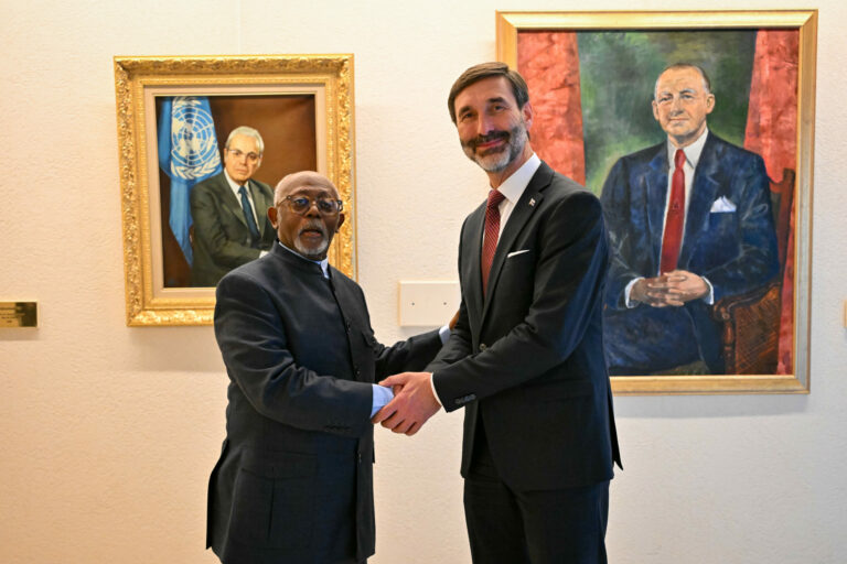 Sprava: Minister zahraničných vecí a európskych záležitostí SR Juraj Blanár a minister zahraničných vecí Kamerunu Lejeune Mbella Mbella v rámci pracovnej návštevy ministra vo Švajčiarsku. Ženeva, Švajčiarsko, 27. február 2025. Foto: SITA/MZV