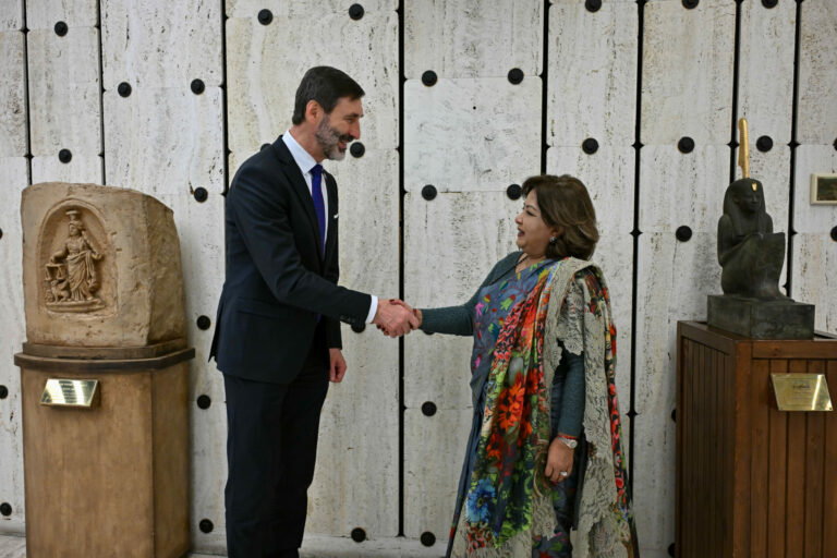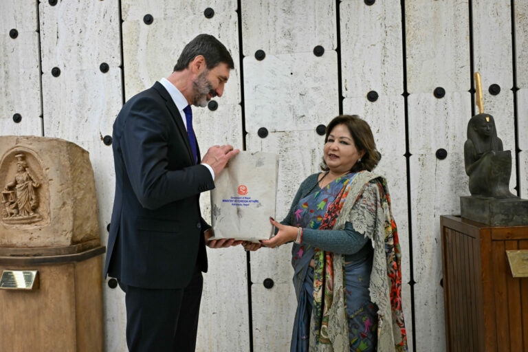 Zľava: Minister zahraničných vecí a európskych záležitostí SR Juraj Blanár a nepálska ministerka zahraničných vecí Arzu Rana Deuba v rámci pracovnej návštevy ministra vo Švajčiarsku. Ženeva, Švajčiarsko, 27. február 2025. Foto: SITA/MZV