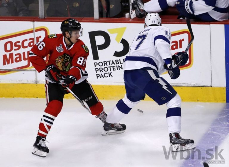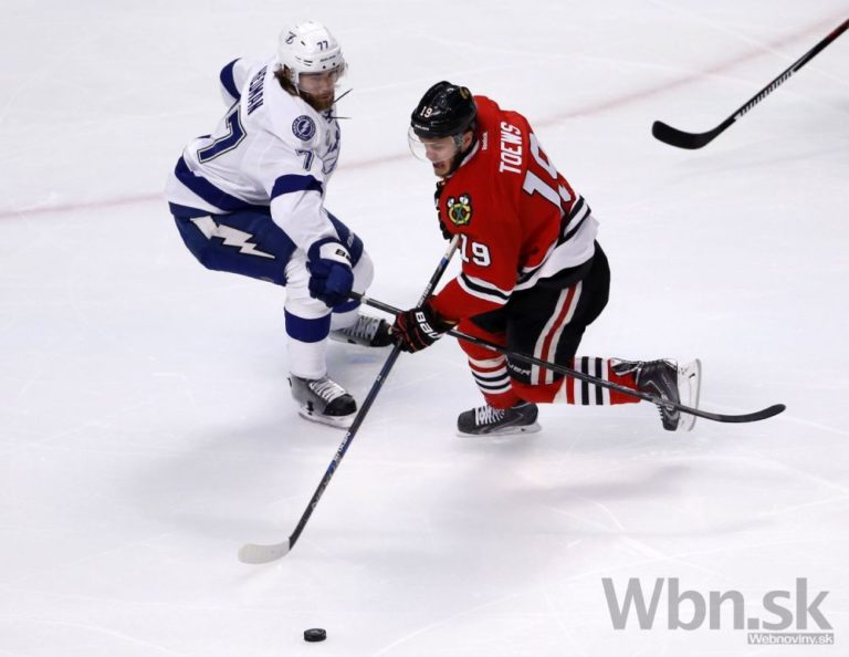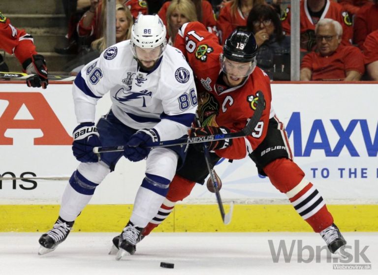 Kapitán Chicaga Jonathan Toews v súboji s útočníkom Tampy Bay Nikitom Kučerovom počas tretieho finálového zápasu NHL, v ktorom 'blesky' zvíťazili 3:2. Chicago, 8 jún 2015. Foto: SITA/AP