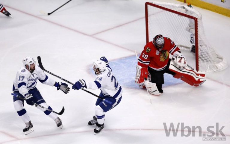 Puk z hokejky útočníka Tampy Bay Ryana Callahana končí za chrbtom brankára Chicaga Blackhawks Coreyho Crawforda počas tretieho finálového zápasu NHL, v ktorom 'blesky' zvíťazili 3:2. Chicago, 8 jún 2015. Foto: SITA/AP