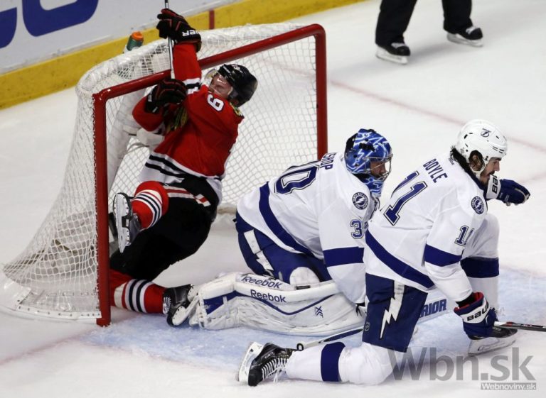 Zrážka útočníka Chicaga Blackhawks Jonathana Toewsa s brankárom Tampy Bay Benom Bishopom počas tretieho finálového zápasu NHL, v ktorom 'blesky' zvíťazili 3:2. Chicago, 8 jún 2015. Foto: SITA/AP