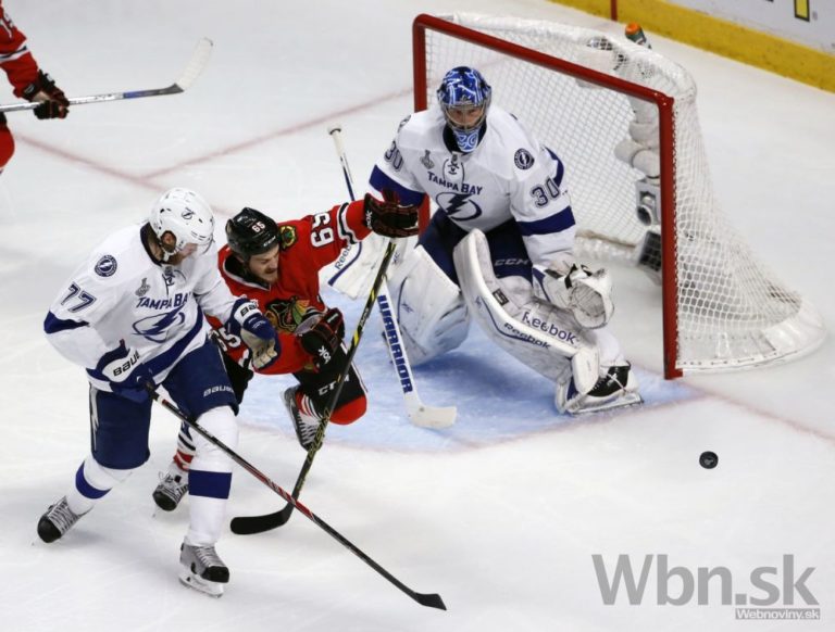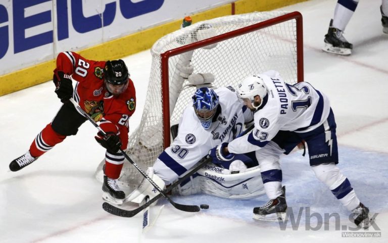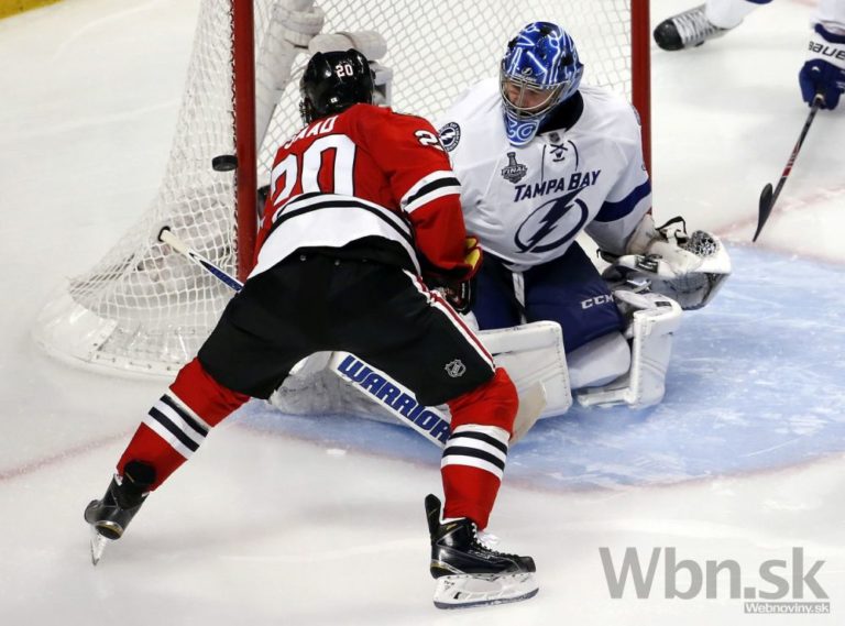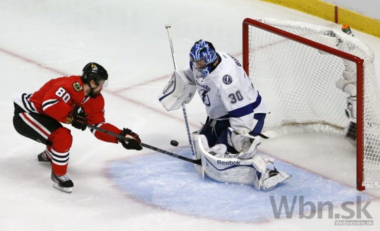 Útočník Chicaga Blackhawks Antoine Vermette sa snaží prekonať brankára Tampy Bay Bena Bishopa počas tretieho finálového zápasu NHL, v ktorom 'blesky' zvíťazili 3:2. Chicago, 8 jún 2015. Foto: SITA/AP