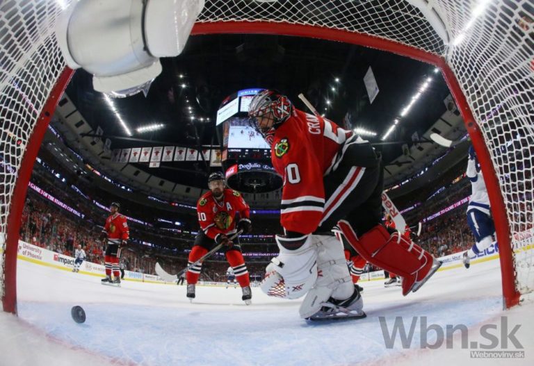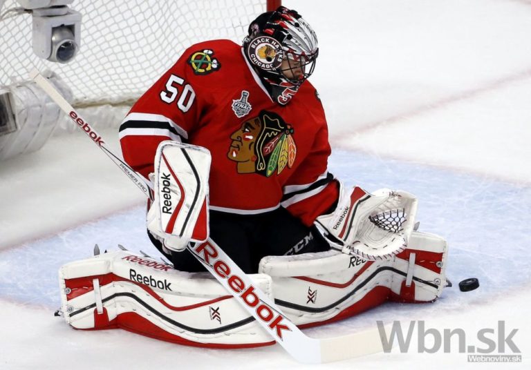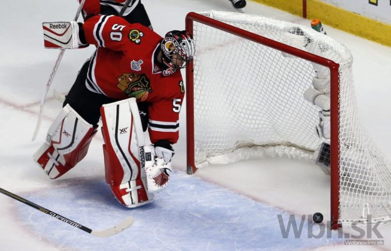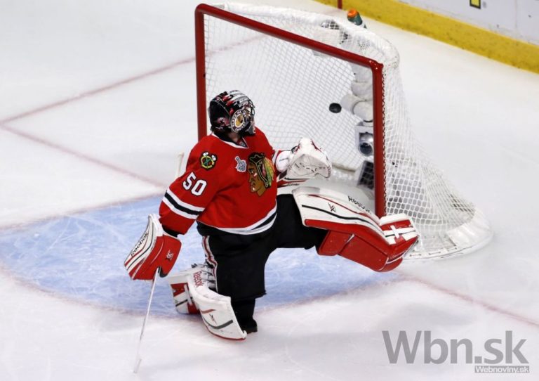 Brankár Chicaga Blackhawks Corey Crawford betónom vyráža puk počas tretieho finálového zápasu NHL, v ktorom 'blesky' zvíťazili 3:2. Chicago, 8 jún 2015. Foto: SITA/AP