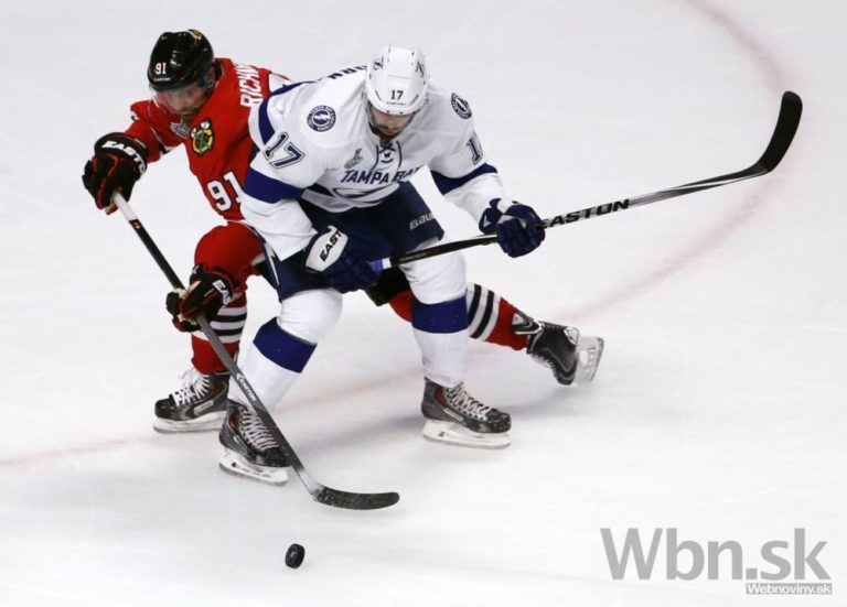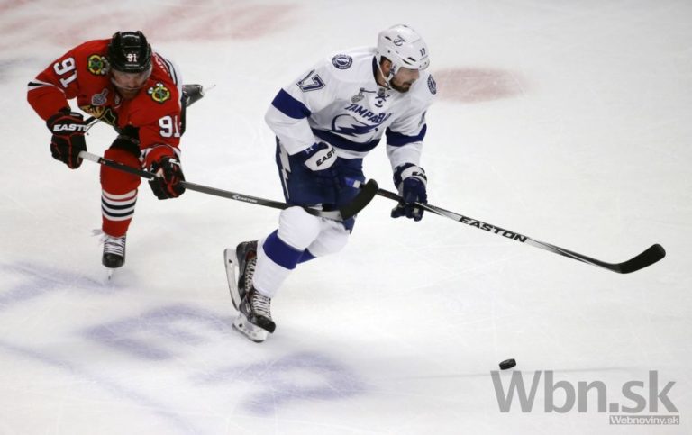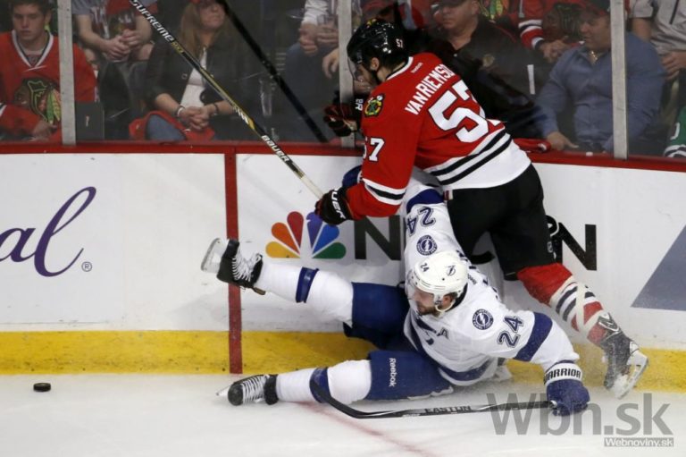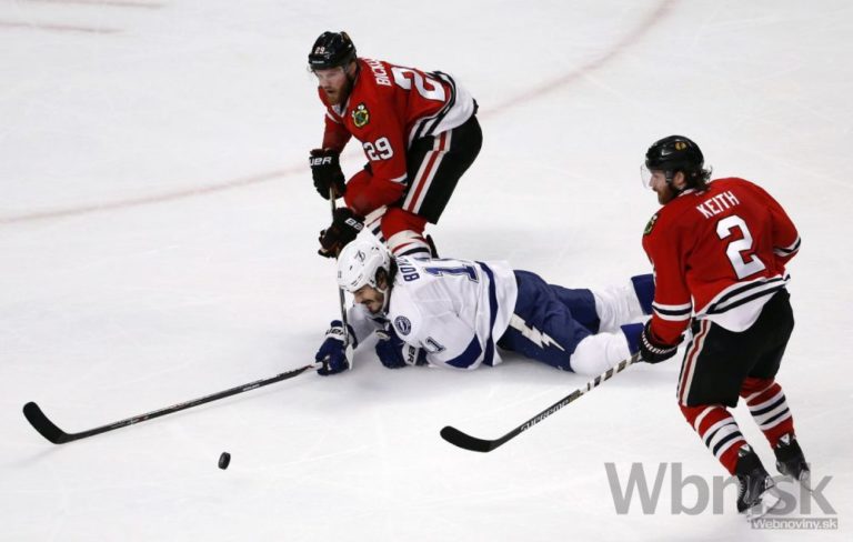 Útočník Tampy Bay Steven Stamkos sleduje súboj svojho spoluhráča Braydona Coburna s útočníkom Chicaga Mariánom Hossom počas tretieho finálového zápasu NHL, v ktorom 'blesky' zvíťazili na ľade Blackhawks 3:2. Chicago, 8. jún 2015. Foto: SITA/AP