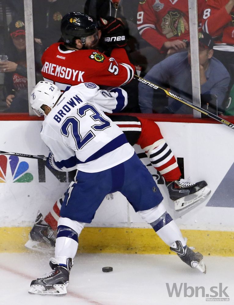 Obranca Chicaga Trevor van Riemsdyk v súboji s útočníkom Tampy Bay J.T. Brownom počas tretieho finálového zápasu NHL, v ktorom 'blesky' zvíťazili 3:2. Chicago, 8 jún 2015. Foto: SITA/AP