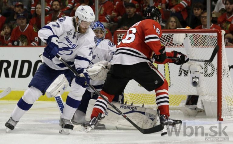 Útočník Chicaga Blackhawks Brandon Saad sa snaží prekonať brankára Tampy Bay Bena Bishopa počas tretieho finálového zápasu NHL, v ktorom 'blesky' zvíťazili 3:2. Chicago, 8 jún 2015. Foto: SITA/AP