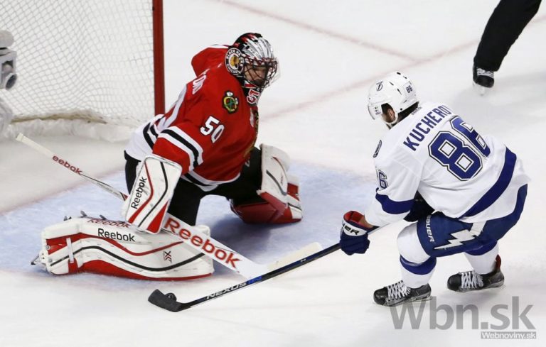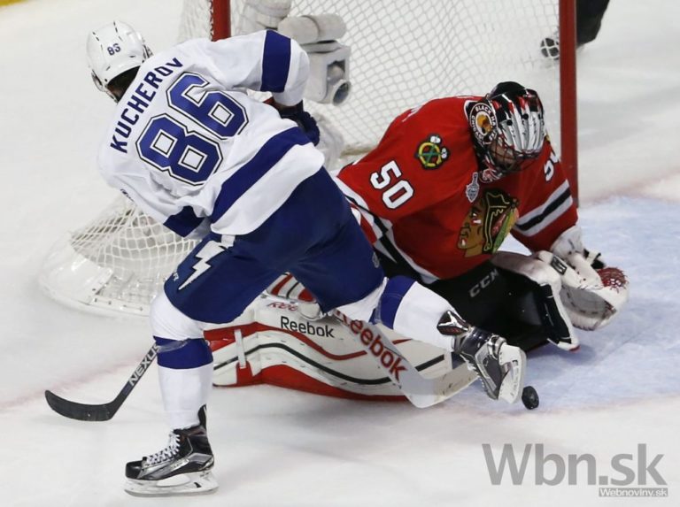 Útočník Tampy Bay Nikita Kučerov sa snaží prekonať brankára Chicaga Blackhawks Coreyho Crawforda počas tretieho finálového zápasu NHL, v ktorom 'blesky' zvíťazili 3:2. Chicago, 8 jún 2015. Foto: SITA/AP
