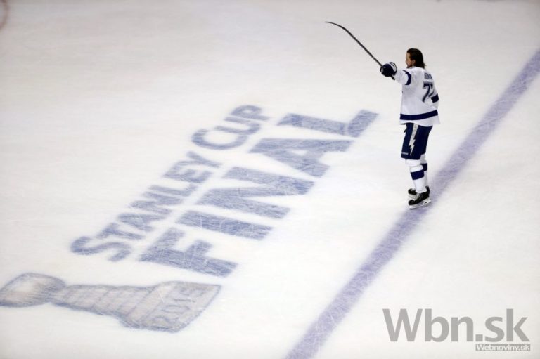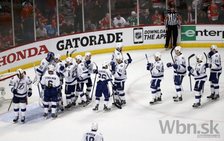 Hráči Tampy Bay sa tešia z triumfu v treťom finálovom zápase NHL, v ktorom na ľade Chicaga zvíťazili 3:2. Chicago, 8 jún 2015. Foto: SITA/AP