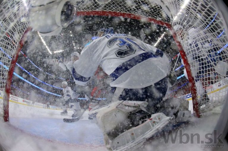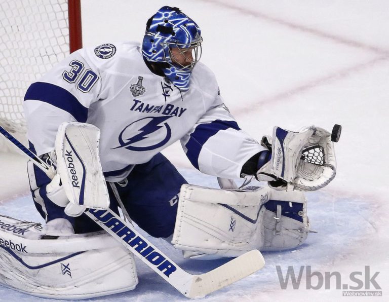 Brankár Tampy Bay Ben Bishop chytá puk do lapačky počas tretieho finálového zápasu NHL, v ktorom jeho tím vyhral na ľade Chicaga 3:2. Chicago, 8 jún 2015. Foto: SITA/AP